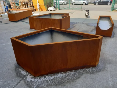 Designed as a sculptural planter or light, the same shape can also be used as a planted bench or pond. A smaller version is also available. for interior or exterior use available in al Ral colours and finishes including rust.